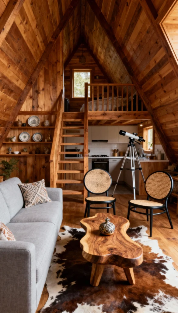 Lean into the rustic charm of an A-frame architecture with floor-to-ceiling timber paneling. Create a conversation zone with a compact grey sofa and two cane-back chairs with black frames. Anchor the space with a faux cowhide rug to enhance the woodland lodge vibe. Use a live-edge wooden coffee table to bring organic shapes into the center of the room. Set up a telescope near the kitchen area to encourage stargazing through the high windows. Utilize open shelving to display rustic pottery and ceramics that complement the wood tones.