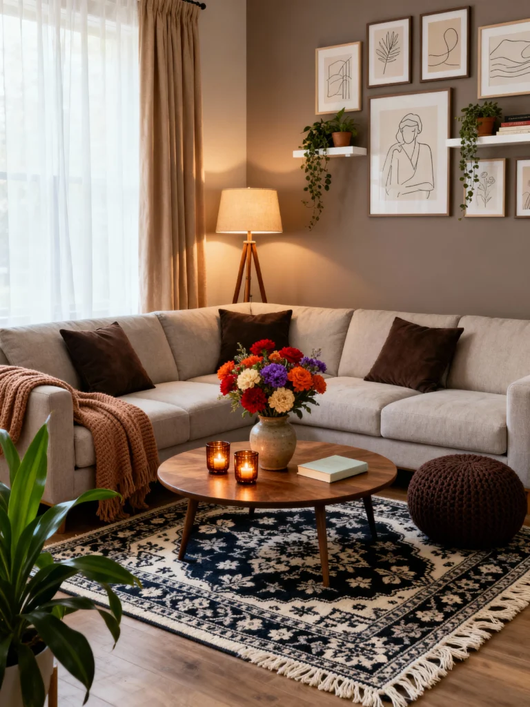 Anchor your living space with a plush, oatmeal-colored sectional to maximize seating without overwhelming the room. Toss on velvety, dark chocolate throw pillows to create depth against the neutral fabric. Center the arrangement around a low, round wooden coffee table, styling it with a vibrant bouquet of dahlias to introduce a pop of life. Create a curated gallery wall behind the sofa using unmatched wooden frames filled with simple line art and botanical prints. Finish the look with a tripod floor lamp to cast a warm, reading-ready glow over the corner.