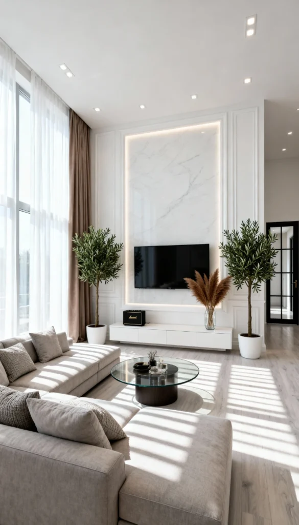Elevate your space with a floor-to-ceiling white marble feature wall framed by classic molding. Flank the television with two tall, manicured olive trees in white planters to add symmetry and life. Choose a large, light grey sectional sofa with clean lines for a modern, understated look. Lay pale wood flooring to keep the room feeling expansive and bright. Use a glass and dark metal round coffee table to maintain a sophisticated, airy feel. Keep the lighting recessed and minimal to let the natural light from the tall windows take center stage.