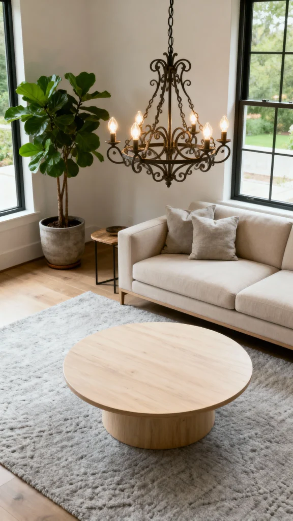 Accent lighting plays a key role in blending modern and earthy styles in your living room. Choose fixtures that mix materials like metal and wood to highlight that cozy yet contemporary vibe. A stylish chandelier can serve as a focal point, adding warmth and charm to your space.