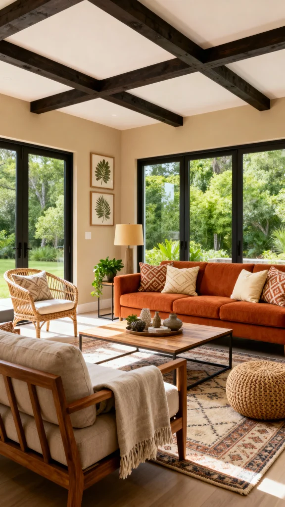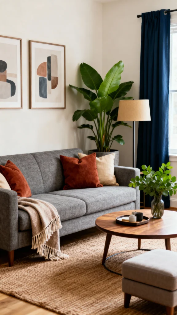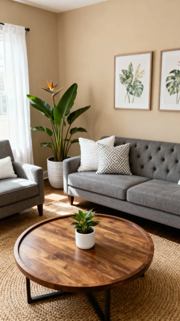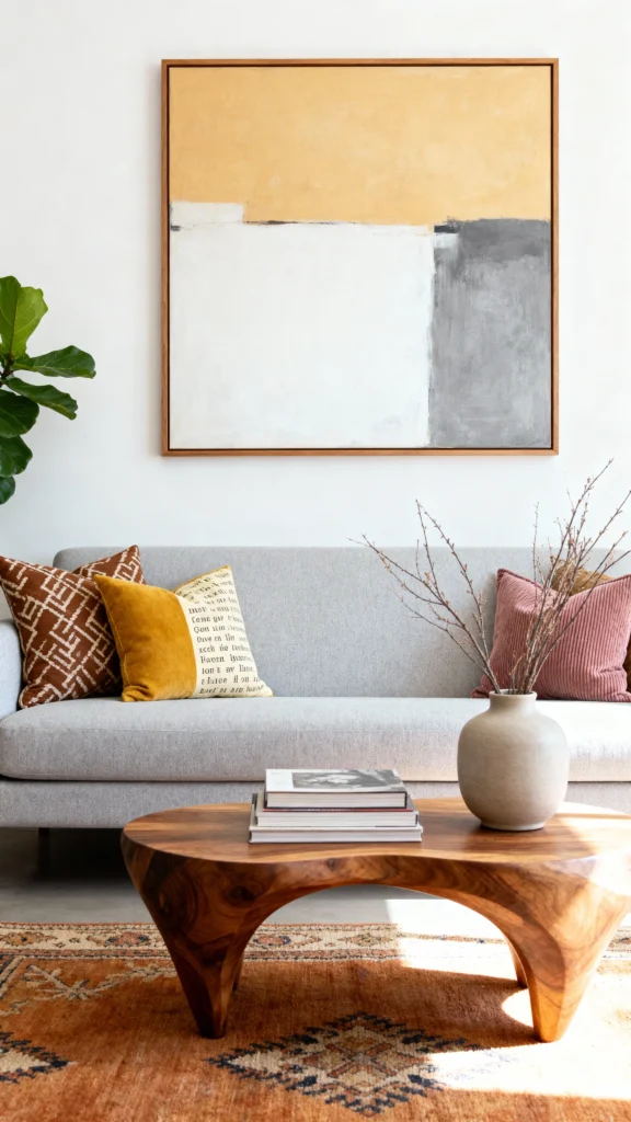 To blend modern and earthy styles, start by choosing a bold statement piece that catches the eye. A unique artwork or a sculptural coffee table can set the tone for your space. This adds personality while enhancing the cozy, earthy vibe you want.