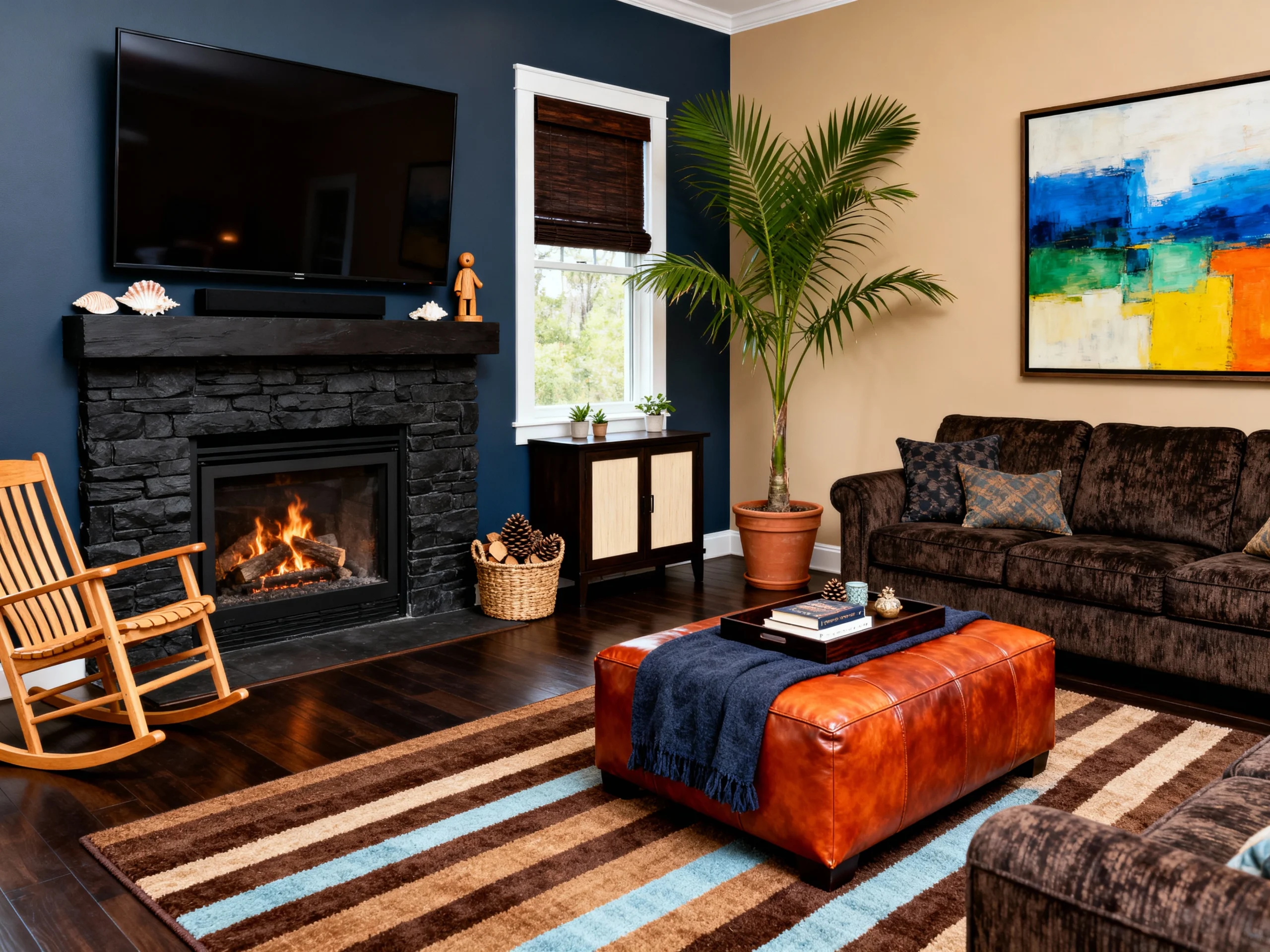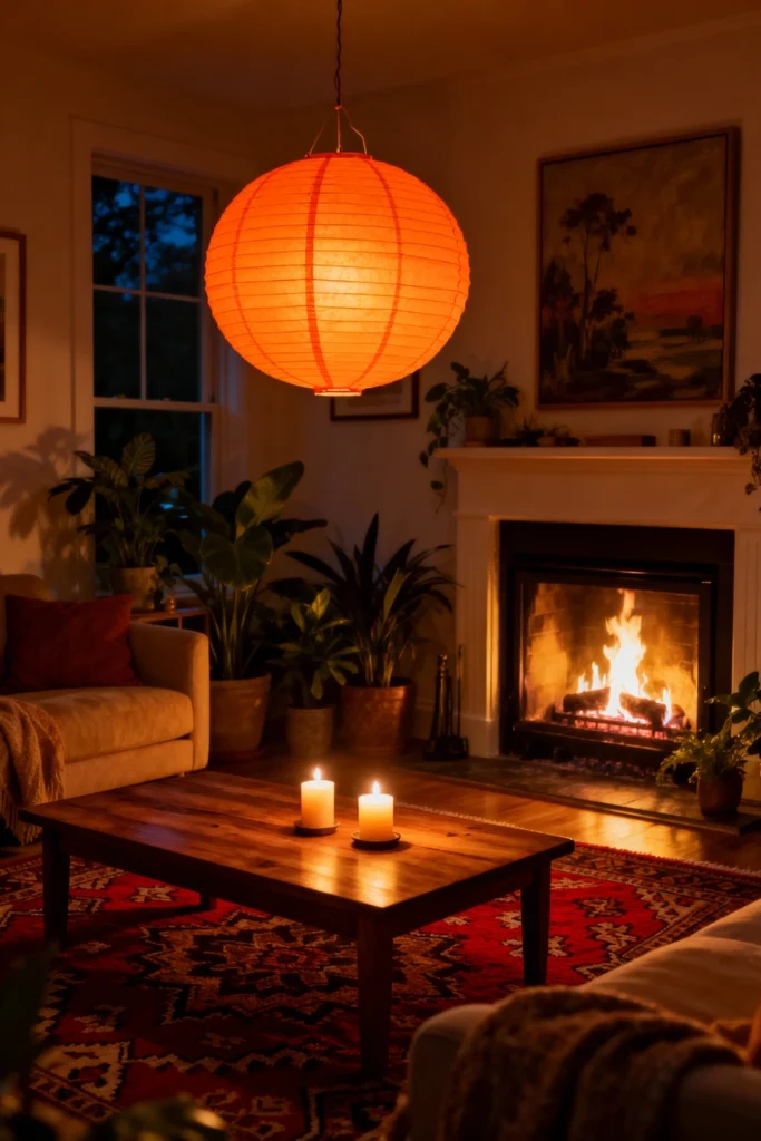 Suspend a large, warm-toned orange paper lantern from the ceiling to act as your primary, soft light source. Arrange plenty of potted plants—monsteras and ferns—around the room to bring the outdoors in. Orient your furniture toward a crackling fireplace to create an intimate gathering spot. Use a low-profile wooden coffee table and light pillar candles for ambiance. Lay down a rich, red patterned rug to add bohemian flair and warmth to the dark wood floors. It’s the perfect spot for quiet reflection.