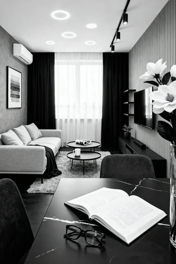 Create a sophisticated monochrome look by sticking strictly to black, white, and grey tones. Install a vertical slat wall behind your TV to add texture without breaking the color scheme. Choose a light grey sofa with clean lines and pair it with nesting round black coffee tables. Use a black marble dining table in the foreground to anchor the open-concept space. Soften the stark contrast with a high-pile grey rug. Finally, install track lighting on the ceiling to direct focus exactly where you want it.
