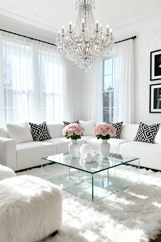 Embrace pure luxury with an all-white color palette. Hang a massive crystal chandelier as the crown jewel of the room. Select a pristine white sectional sofa and pile it high with faux fur throw pillows for texture. Use a modern glass coffee table to keep the visual space open and airy. Decorate with vases of soft pink roses to add just a whisper of color. Lay down a thick, white shag rug that covers the floor, making the entire room feel like you are walking on a cloud.