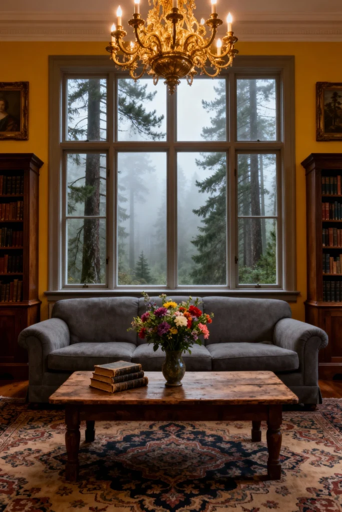 Frame a stunning forest view with tall, unadorned windows that let the foggy natural light pour in. Center a classic grey sofa facing the view to prioritize nature over technology. Place a solid wood farmhouse table in the center, stacked with antique leather-bound books. Flank the window with tall, dark wood bookcases to create a scholarly library atmosphere. Hang an intricate brass chandelier to add a touch of old-world elegance. Keep the floral arrangements wild and colorful to contrast against the moody, grey outdoor backdrop.