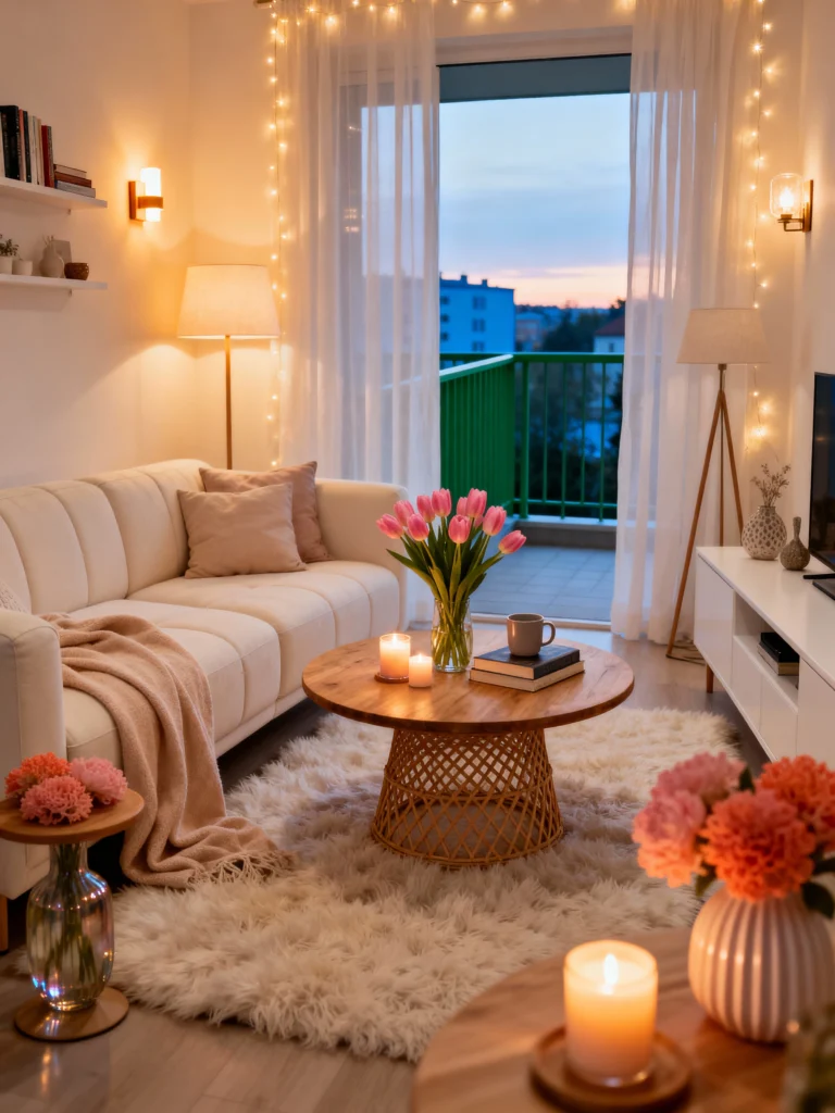 Create a dreamy evening retreat by draping string fairy lights around your window frame. Choose a cream-colored tufted sofa and layer it with blush pink pillows and a chunky knit throw. Place a round wooden coffee table with a rattan base in the center to add warmth. Fill vases with fresh pink tulips and light several pillar candles to enhance the golden hour glow. Use a high-pile fluffy rug to keep the floor soft and inviting, perfect for watching the sunset from your balcony.