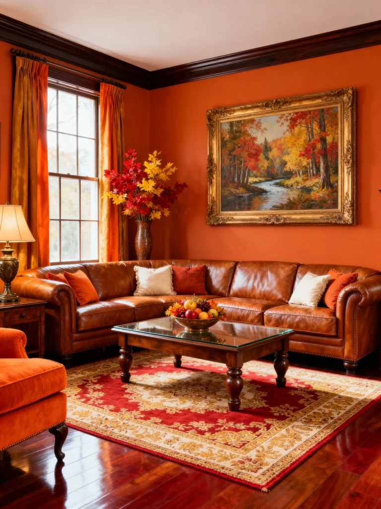 Paint your walls a rich, terracotta orange to embrace a cozy, autumnal atmosphere. Choose a large, L-shaped caramel leather sectional that invites lounging. Anchor the space with a large, traditional rug featuring deep reds and golds. Place a heavy wooden coffee table with a glass top in the center. Fill a bowl with seasonal fruit as a simple centerpiece. Hang an oversized, gold-framed painting of a fall forest landscape to act as a window into nature. Use floor-to-ceiling gold curtains to complement the warm wall tones.