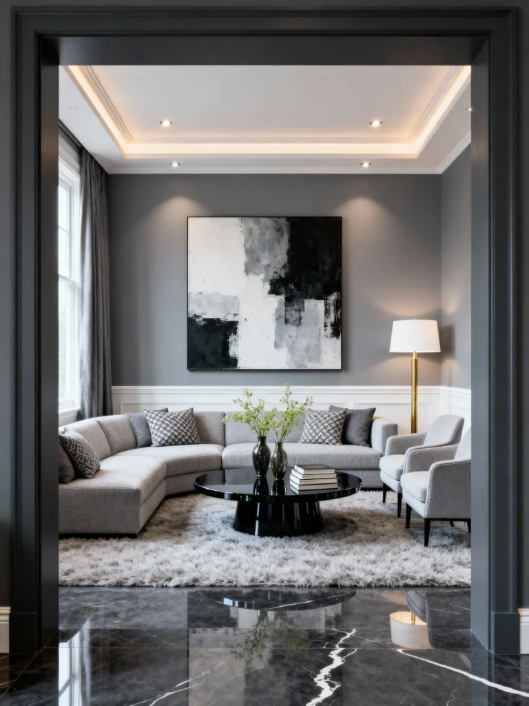 Stick to a strict palette of greys, blacks, and whites. Paint the walls a medium grey and add white wainscoting for structure. Choose a light grey, modern sectional sofa with clean lines. Lay down a fluffy grey rug over polished black marble floors. Place a sleek, glossy black round coffee table in the center. Hang a large, square abstract painting in black, white, and grey tones. Use a tall floor lamp with a white shade and gold stand to add a single metallic accent.