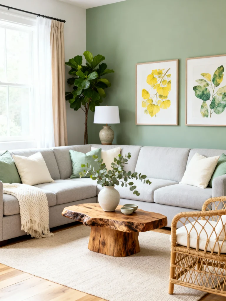 Paint a feature wall in a soft sage green. Hang two light wood-framed botanical prints of leaves to bring nature indoors. Choose a pale grey sectional sofa for neutral comfort. Incorporate a live-edge wooden coffee table to add raw, natural texture. Place a rattan accent chair with white cushions to enhance the organic feel. Add a tall tree in the corner to blur the line between indoors and outdoors. Keep accessories minimal, using ceramic vases in neutral earth tones.
