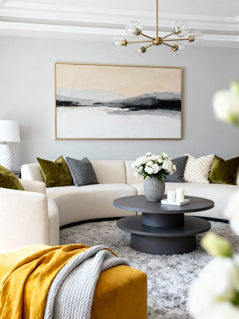 Opt for a curved, cream-colored sectional sofa to soften the flow of the room. Place a two-tiered, charcoal grey round coffee table in the center for a modern, architectural touch. Lay down a plush, high-pile grey rug to add serious texture and comfort underfoot. Add olive green velvet pillows to bring in earthy tones. Hang a large, horizontal abstract painting featuring neutral creams, blacks, and greys to draw the eye. Install a modern brass chandelier with glass globes to keep the ceiling feeling light and airy.