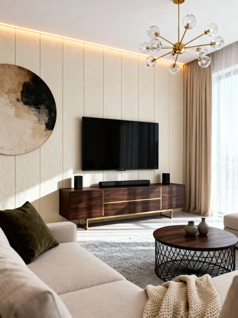 Install textured, beige vertical paneling on your main wall to add depth without color. Choose a sleek, dark walnut media console with brass inlay lines for a mid-century modern touch. Mount your TV above it, but balance the technology with a large, round abstract artwork on the side. Select a modern sputnik-style chandelier in gold to draw the eye upward. Use a round, open-framework coffee table to keep the floor space looking open. keep the color palette strictly neutral, relying on wood grains and fabric textures for interest.