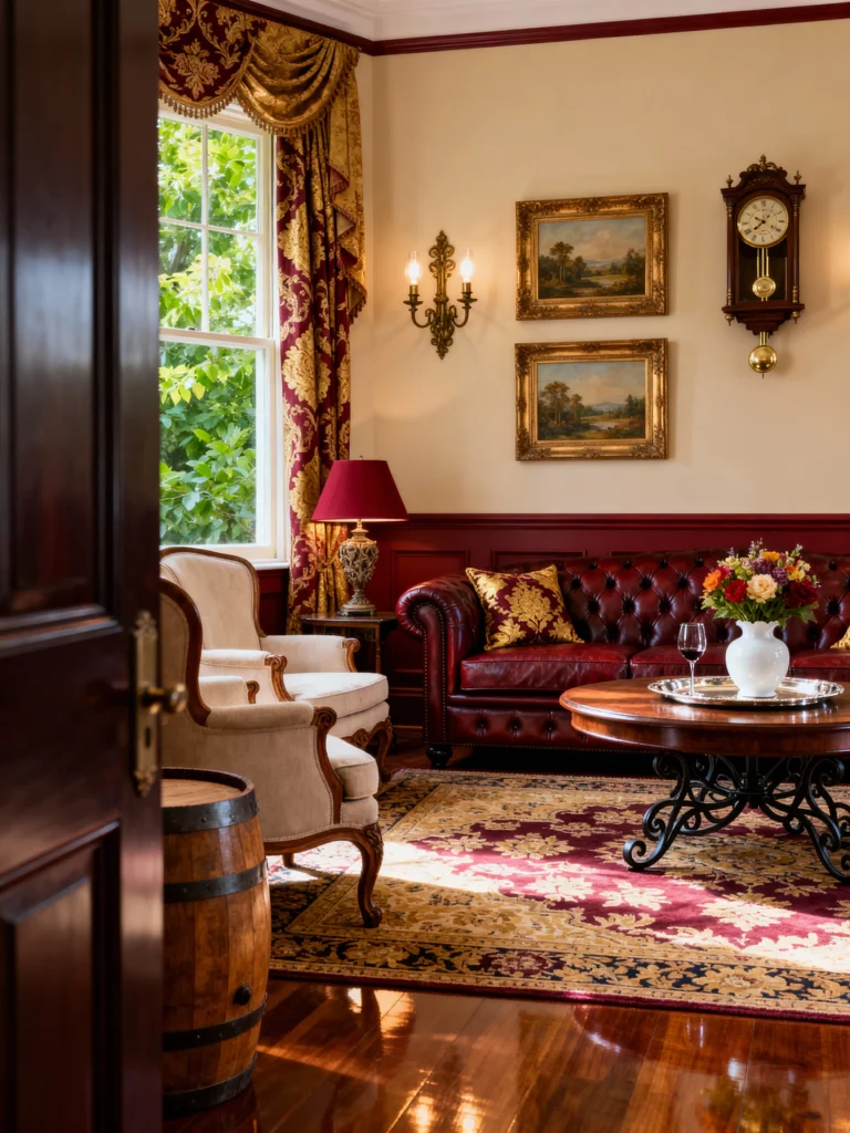 Start with a warm cream wall color and add burgundy wainscoting for a traditional foundation. Select a deep red, tufted leather sofa to serve as the room’s centerpiece. Hang heavy, gold-and-red floral drapes to frame the window dramatically. intricate antique wall sconces on either side of the window for soft lighting. Mount a classic wooden wall clock to add a sense of old-world charm. Finish the look by hanging gold-framed landscape oil paintings to elevate the space with a sense of history and grandeur.