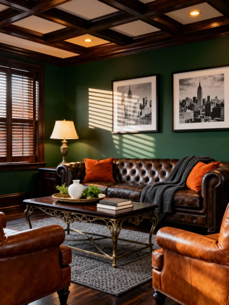 Paint your walls a deep, hunter green to create a moody, sophisticated backdrop. Choose a classic Chesterfield sofa in distressed brown leather to anchor the room with weight and history. Toss on a few burnt orange velvet pillows for a warm pop of color. Lay down a textured grey rug to define the seating area. Place a rectangular coffee table with ornate brass legs and a dark wood top in the center. Finally, hang two large, black-and-white framed photographs of city architecture side-by-side to bring in that metropolitan vibe.