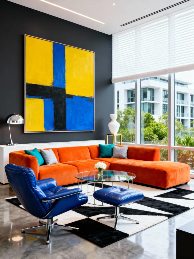 Start with a dark charcoal or black wall to make colors pop. Choose a bold, orange velvet sectional sofa as your statement piece. Add a bright electric blue leather chair for a high-contrast companion. Lay down a graphic black and white geometric rug to ground the colorful furniture. Hang a massive piece of abstract art featuring blocks of yellow and blue. Keep the coffee table simple—glass and chrome—so it doesn’t distract from the color explosion happening around it.