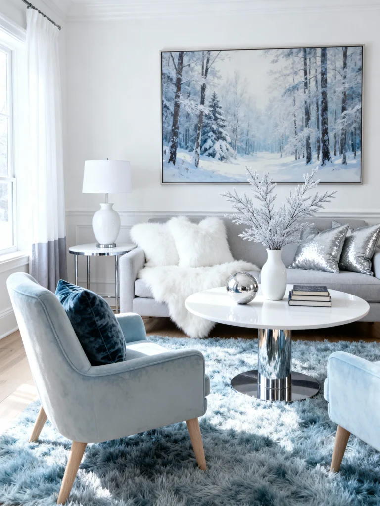 Paint the walls a crisp, cool white. Select a light grey mid-century modern sofa and pile it with white faux fur throws and silver sequin pillows. choose a pair of ice-blue velvet armchairs with light wood legs. Lay down a shaggy, blue ombre rug that mimics the look of water or ice. Use a glossy white pedestal coffee table to reflect the light. Finish the look with a large canvas painting of a snowy winter forest to complete the frosty, elegant theme.
