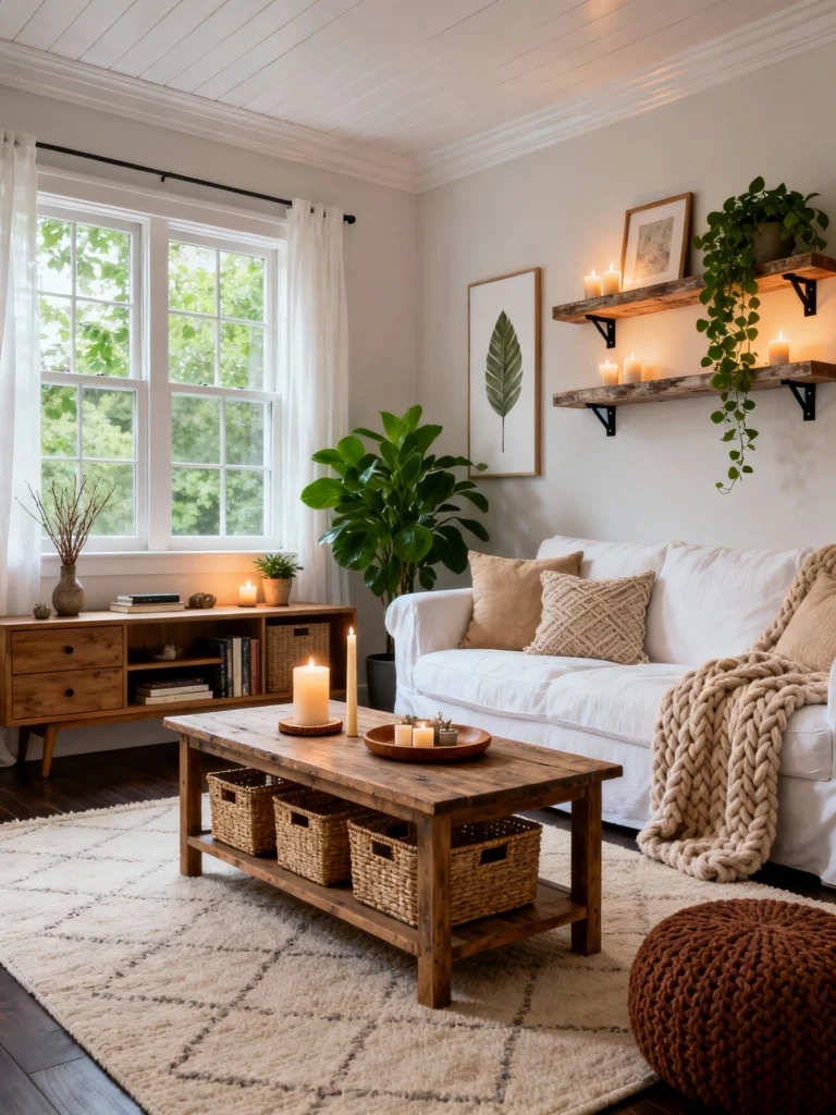 Start with a bright, airy foundation by painting the walls a soft white. Choose a slipcovered white sofa and layer it with a chunky, oatmeal-colored knit throw for instant texture. Install rustic floating wood shelves above the seating area to display warm candlelight and trailing ivy plants. Center the room with a distressed wooden coffee table to add a touch of farmhouse charm. Keep your storage practical with woven baskets tucked underneath the table. Finish the look with a large, cream textured rug to define the space and keep your feet warm.