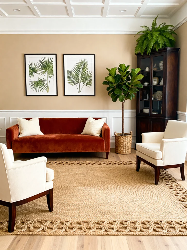 Embrace nature by painting the walls a warm, sandy beige. Choose a velvet sofa in a deep rust color to serve as the room’s anchor. Lay down a large, natural jute rug with intricate woven detailing to define the conversation area. Flank the sofa with simple cream upholstered armchairs for balance. Add a tall fiddle leaf fig tree in a woven basket to bring life and height to the corner. Hang two large botanical prints in black frames to echo the greenery and keep the vibe fresh.