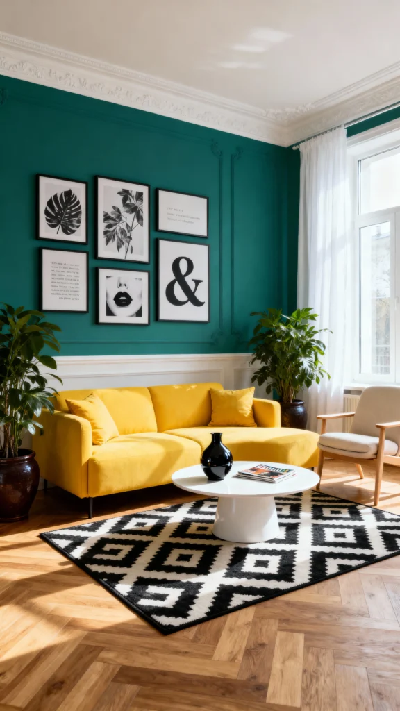 Paint your walls a deep, moody teal to make your furniture pop. Place a bright yellow modern sofa right in the center for a striking color contrast. Create a gallery wall using black and white typography and botanical prints to break up the solid wall color. Throw down a bold black and white geometric rug to add pattern to the beautiful herringbone wood floors. Add a sleek, white glossy round coffee table to keep the look modern and uncluttered. Don’t forget a large potted plant to bridge the gap between the colors.