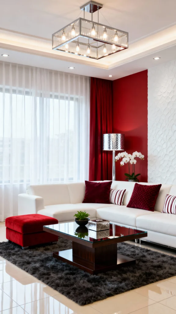 Create a crisp, modern look by pairing a pure white leather sectional against a deep red accent wall. Install a textured, white 3D wall panel behind the sofa to add visual interest without adding chaos. Hang floor-to-ceiling red curtains to heighten the drama and frame the windows. Center a glass and wood square coffee table on a dark, charcoal grey shag rug to ground the bright furniture. Add a silver floor lamp with a patterned shade to bring a touch of metallic shine to the corner.