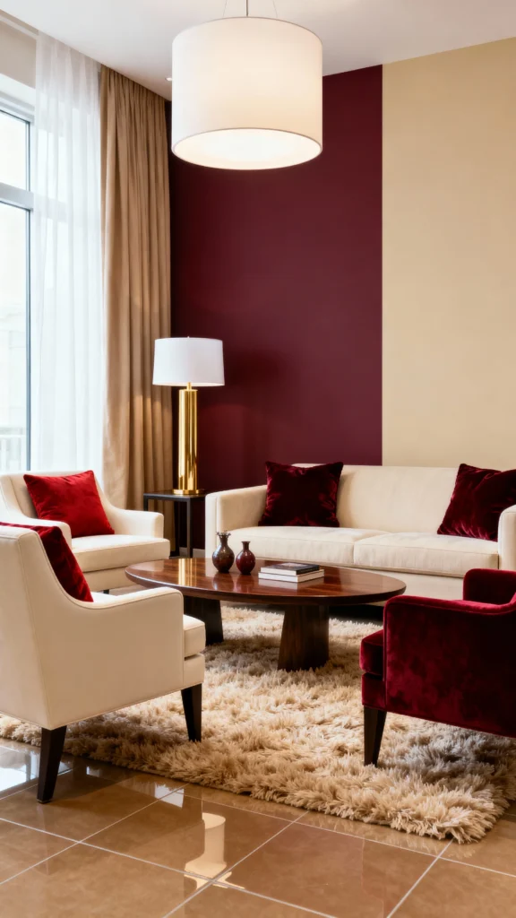Create a striking focal point by color-blocking the wall behind the sofa with deep maroon and creamy beige paint. Opt for a sleek, cream-colored sofa and pair it with structured armchairs in rich red velvet. Place a tall, gold cylinder table lamp on a side table to add a metallic pop and warm lighting. Center a dark wood oval coffee table on a thick, high-pile shag rug for a retro-glam vibe. Toss a few matching red velvet pillows on the couch to tie the whole color scheme together perfectly.