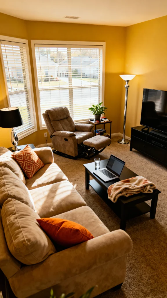 Paint the room a sunny, warm yellow to keep the vibe cheerful. Position a plush, beige recliner near the bay window to take full advantage of the natural daylight. Set up a simple black coffee table that is sturdy enough to hold your laptop and a coffee mug. Stick to a monochromatic tan palette for the sofa and cushions to keep things calm and uncomplicated. Add a sleek silver floor lamp in the corner for task lighting. Keep the layout open and functional for everyday living.