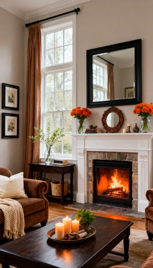 Center your living space around a stone fireplace with a traditional white mantel. Hang a large, square black-framed mirror above the fire to bounce natural light around the room. Arrange chocolate brown velvet armchairs and a matching sofa for a rich, comforting feel. Dress up the mantel with vases of vibrant orange marigolds. Use floor-to-ceiling tan curtains to frame the tall windows elegantly. Place a dark wood coffee table in the center and style it with a tray of pillar candles for a cozy evening atmosphere.