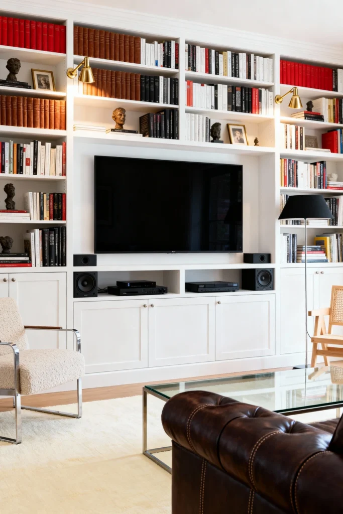 Build a stunning, floor-to-ceiling white shelving unit to frame your television and show off your personal library. Color-block your books—like a striking top shelf of all red spines—to create instant visual art. Add elegant brass sconces directly onto the shelving face to cast a warm spotlight. Bring in a rich, tufted brown leather sofa to ground the bright room. Contrast that traditional piece with a sleek, chrome-framed bouclé armchair for a perfectly balanced aesthetic.