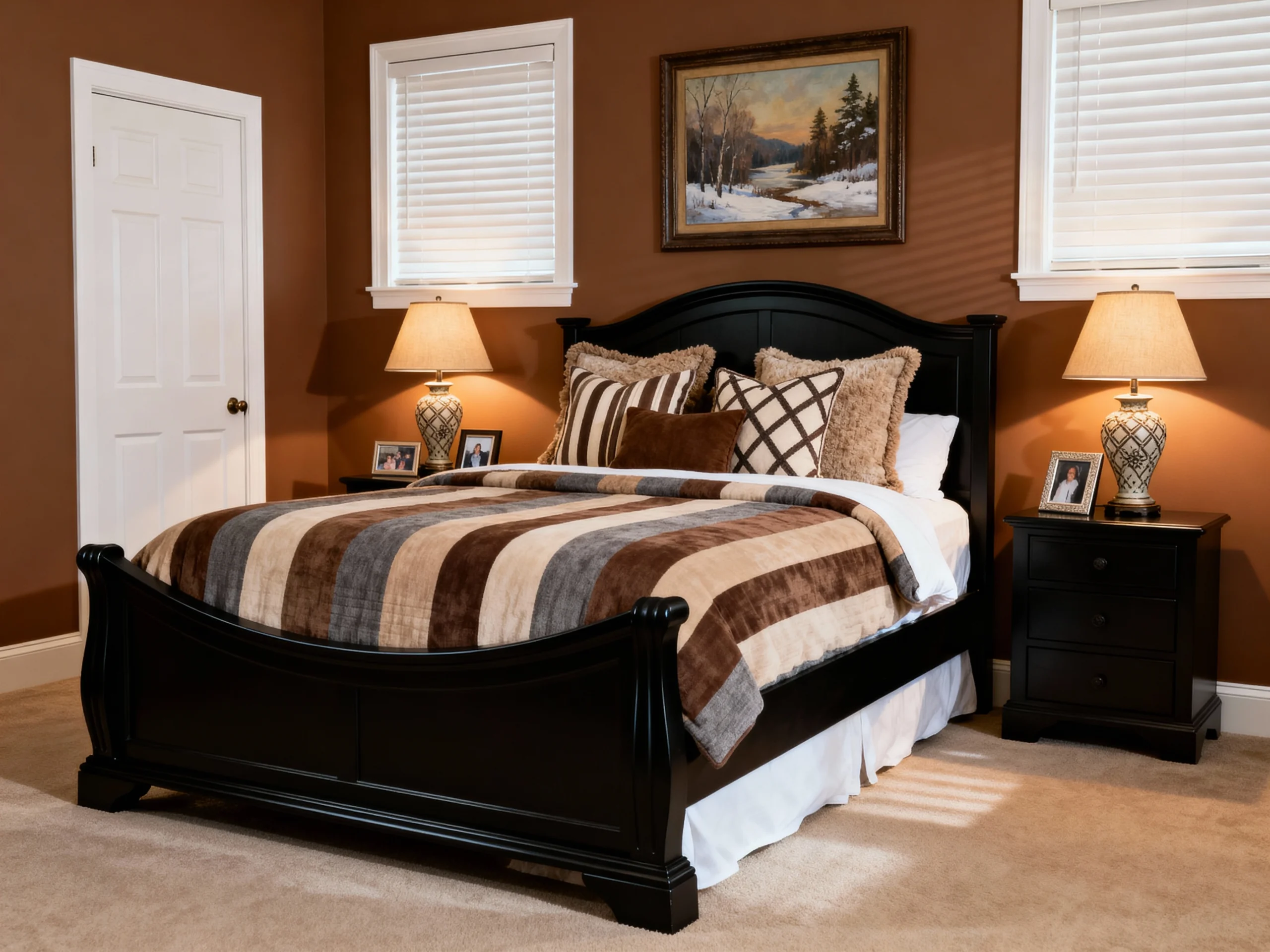 If you love a modern, graphic look, go with a deep charcoal or navy accent wall. Choose a warm wooden bed frame with clean lines. Bring in pops of warmth with burnt orange and terracotta throw pillows and blankets. Hang abstract art with geometric shapes and matching warm tones above the bed to complete the chic, mid-century modern aesthetic.