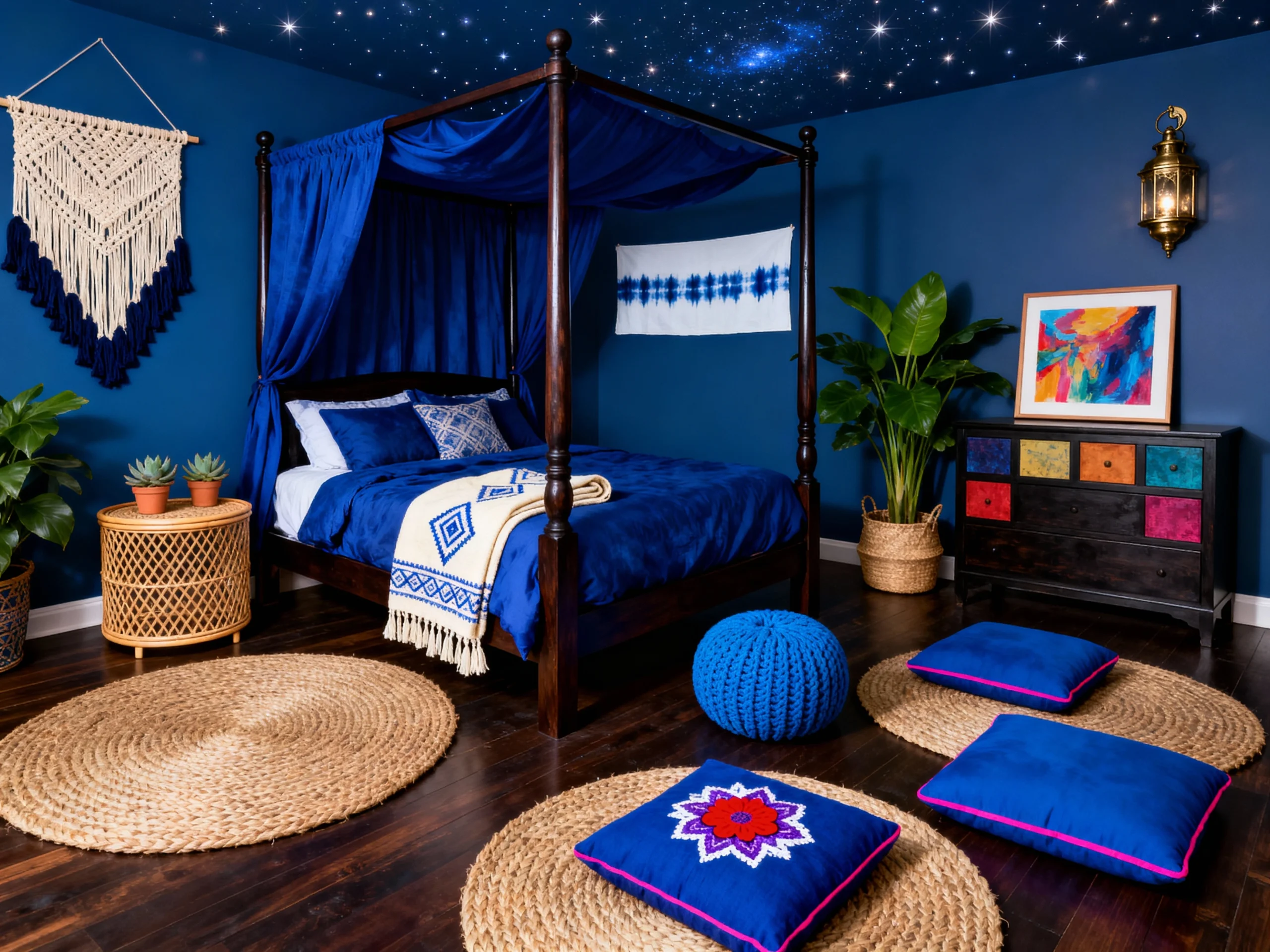 Paint your walls a deep, midnight blue and don’t stop there—add tiny stars to the ceiling for a magical night-sky effect. Center a rich wooden four-poster bed draped in matching fabric to anchor the room. Layer multiple circular jute rugs on the floor to add warmth and texture underfoot. Hang a large, cream macrame piece to contrast beautifully against the dark paint and finish the look with hanging Moroccan lanterns.