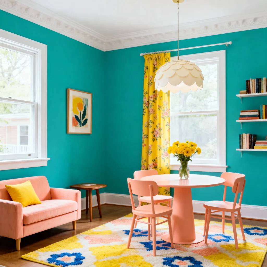 Why be subtle when you can be loud? Teal, coral, and sunny yellow bring the party—perfect for a space that needs some serious energy.