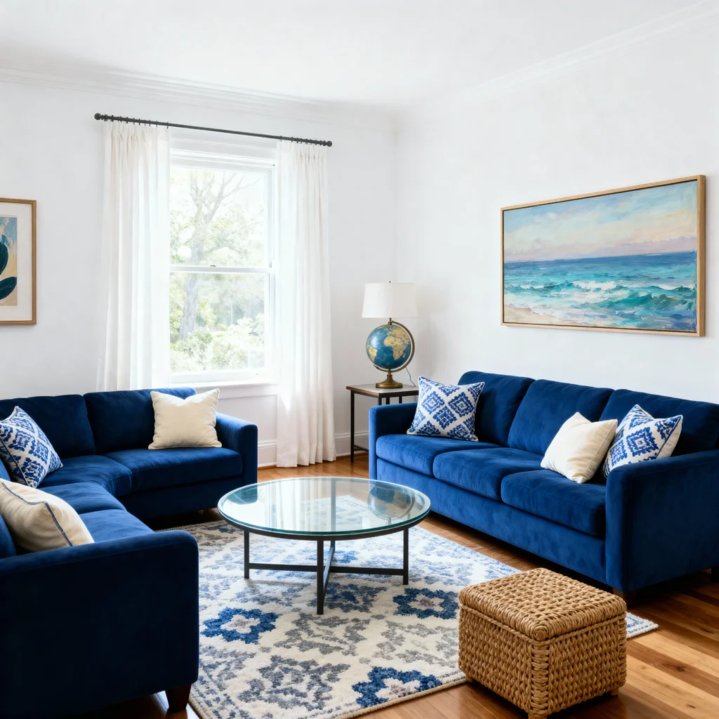 Beach house dreams, anyone? Navy, white, and sand beige bring that seaside chill indoors—minus the sand in your shoes.