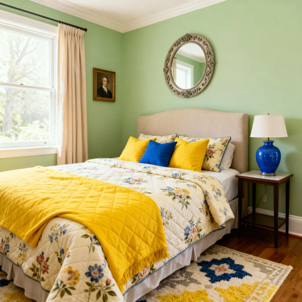 Surprise! Mustard yellow, sage green, and navy sound crazy, but they work. It’s bold, balanced, and totally unique.