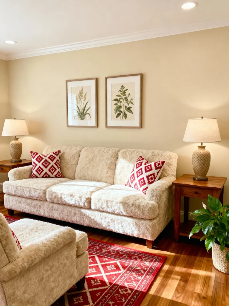 Try pairing your cream walls with a turquoise armchair or a colorful rug. Pick one or two bold pieces that pop against the cream backdrop. This keeps the room lively without losing that cozy, welcoming vibe cream is famous for.