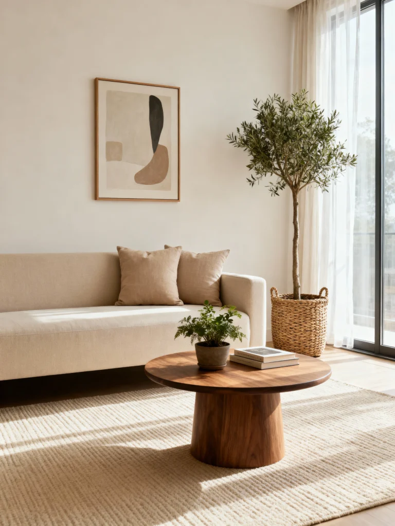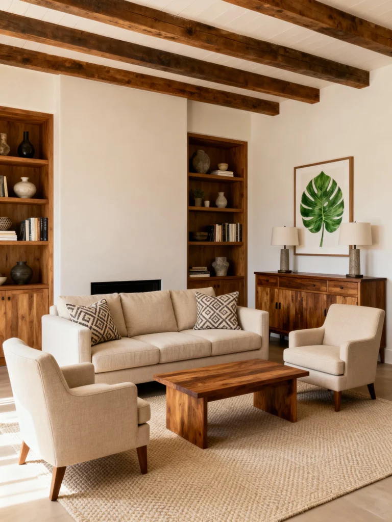 Imagine a cream sofa with a wooden coffee table, maybe some ceiling beams if you’re feeling extra. Add wooden frames or shelves for bonus points. Stick to warm, light wood tones so they blend with the cream instead of clashing.