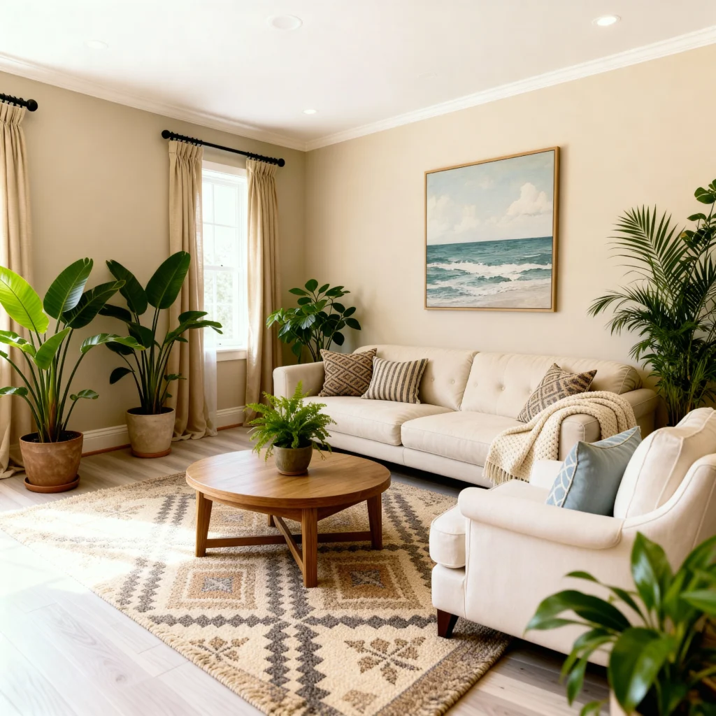 Picture cream walls with blue-and-white striped cushions, a sandy rug, and seashell decor. A driftwood coffee table seals the deal. Think beachy but chic.