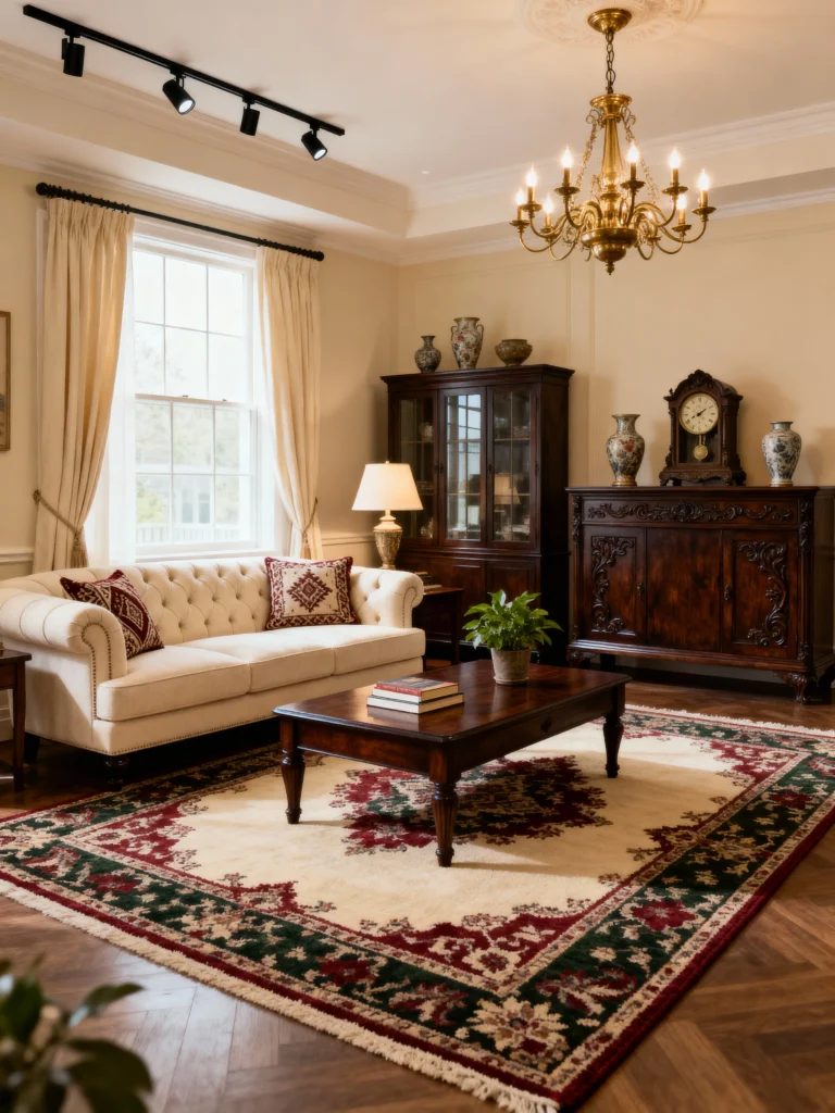 Imagine a cream sofa with a vintage wooden cabinet or an antique mirror. Choose pieces with history—they’ve got stories to tell.