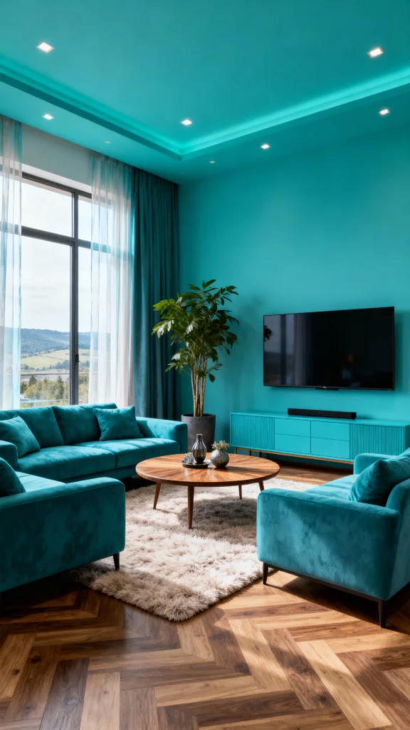 Last up, Bright Turquoise Blue brings beach vibes anywhere. This cheerful shade screams coastal cool—think shutters, doors, or an accent wall. Pair it with whites and sands for classic beachy, or mix with brights for fun. It’s a vacation in paint form. I’d paint my porch this and pretend I’m seaside sipping a piña colada.