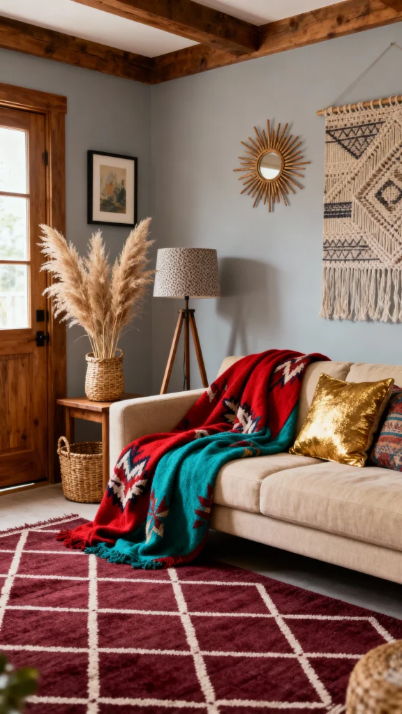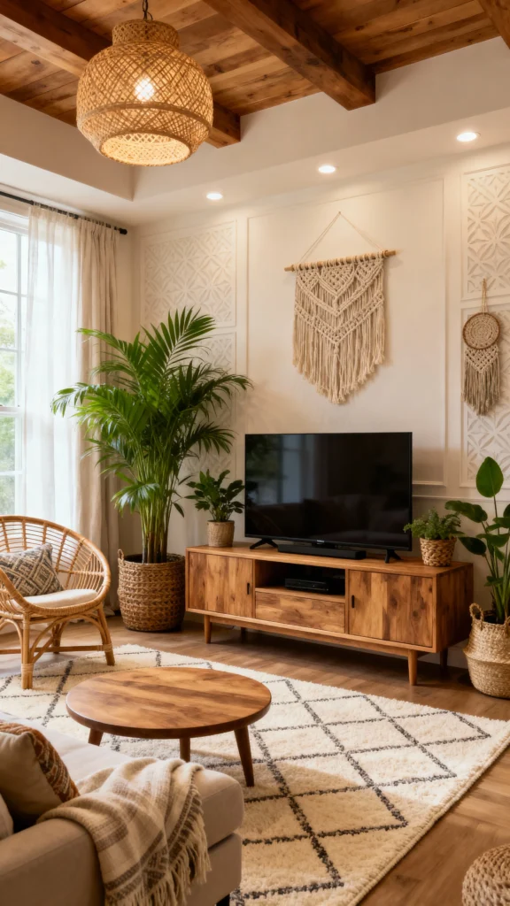 Artisan textiles and throws add a warm touch to any living room. Soft, cozy materials with unique patterns create a relaxed vibe that’s just inviting. Don’t hesitate to layer different textures for a boho look that feels both laid-back and stylish!