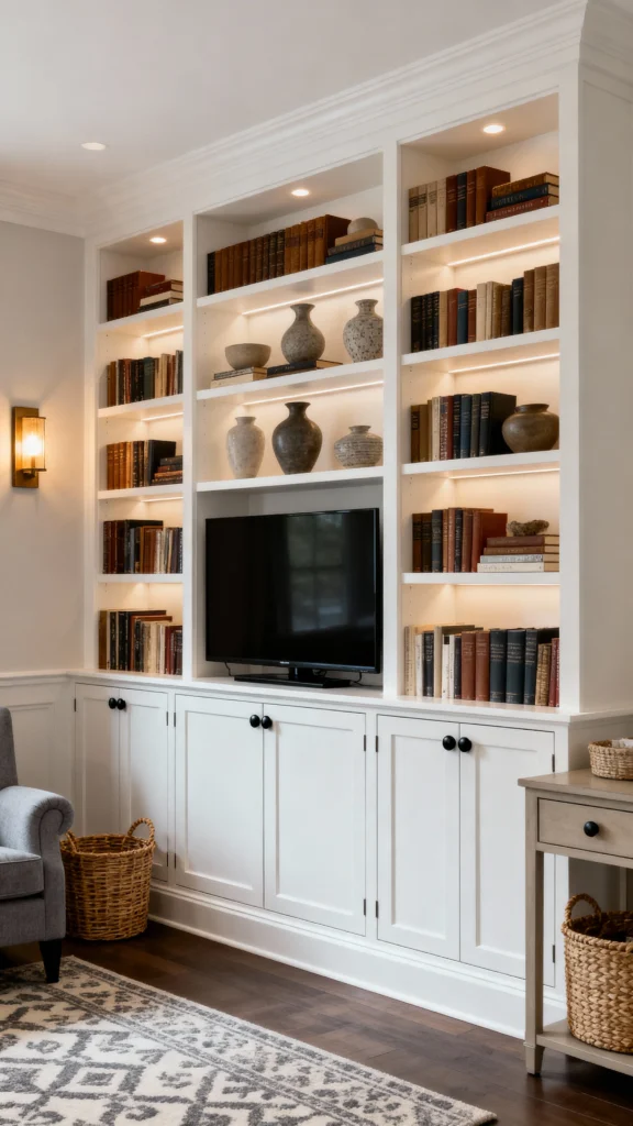 Open shelving is a fun way to mix display and storage in your living room. You can showcase your favorite knick-knacks and books while keeping things organized at the same time. Plus, it adds a cozy touch that feels inviting and personal.