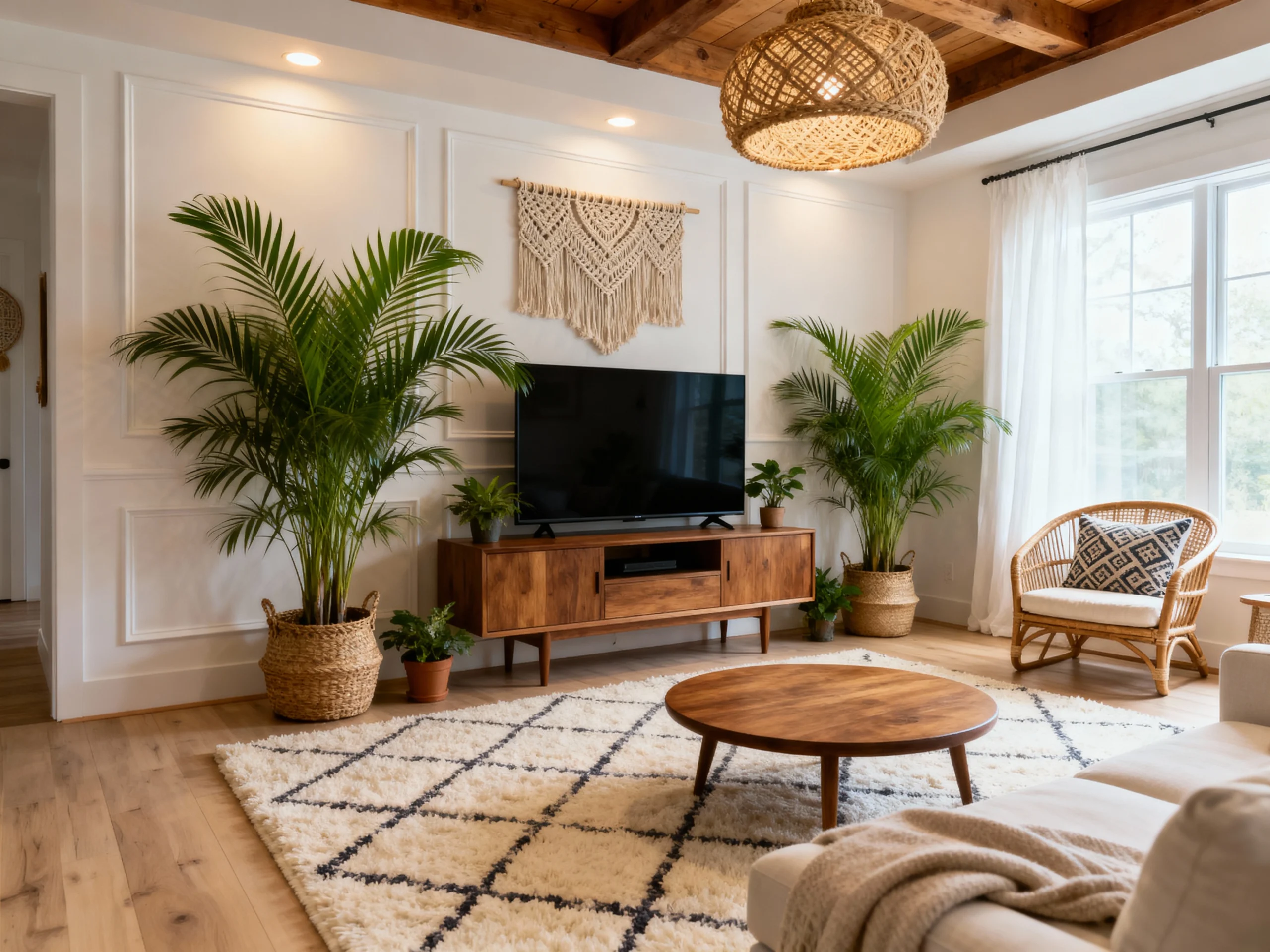 Natural wood furniture with simple lines brings a warm, inviting touch to your living room. The clean design creates a sense of openness, making the space feel airy and relaxed. Pairing these pieces with soft textiles and earthy tones enhances the cozy vibe, perfect for any boho-inspired home.