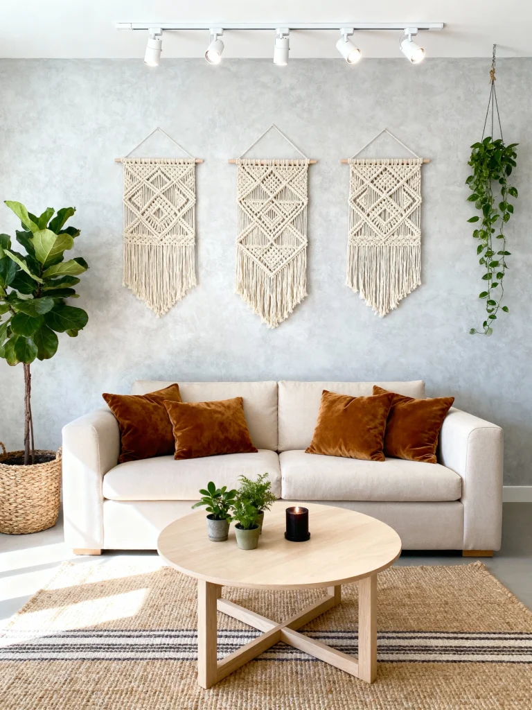Macramé wall hangings add a unique touch to your living room. They blend coziness with a minimal vibe, creating a warm yet stylish atmosphere. Plus, they can easily become a focal point that ties the room together.