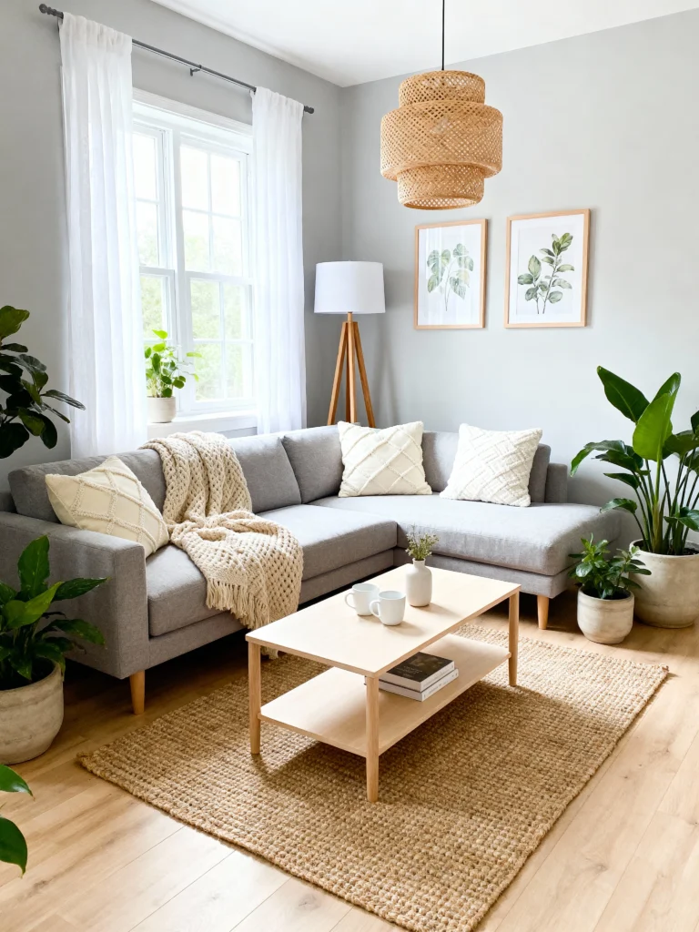 Creating a cozy living space can be as simple as mixing natural textures with a neutral palette. The soft hues of beige and cream paired with wooden elements bring warmth and a laid-back vibe. Add in some greenery and patterned pillows to give your room a friendly touch that feels inviting.