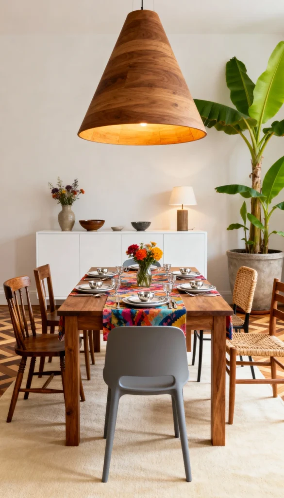 Use a warm wooden table as your centerpiece. Mix and match your dining chairs—try adding a wicker or rattan option and a modern gray chair for visual interest. Hang a massive, conical wooden pendant light to anchor the space and create a cozy glow. Add a colorful, patterned table runner and a large, vibrant potted plant (like that amazing banana tree!) for an instant bohemian lift.