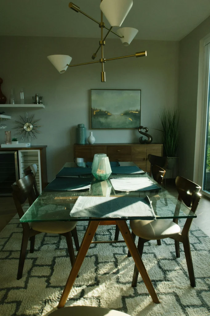 Center the room with a glass-top table with a dramatic wooden A-frame base. Hang a brass and white Mid-Century Modern chandelier to tie the style together. Anchor the seating area with a textured geometric rug. Use a dark wooden sideboard against the wall and accessorize with vintage-inspired decor like a sunburst clock and minimalist vases.