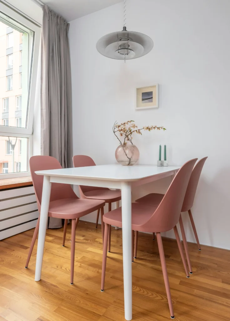 Keep walls and trim crisp white for a clean, Scandinavian look. Use a small, simple white table with straight white legs. Bring in a fun pop of color with modern plastic chairs in dusty rose or pale pink. Hang a minimalist, layered metal pendant light above the table. Keep accessories simple: a vase of branches, and a pair of tall, contrasting green candles.