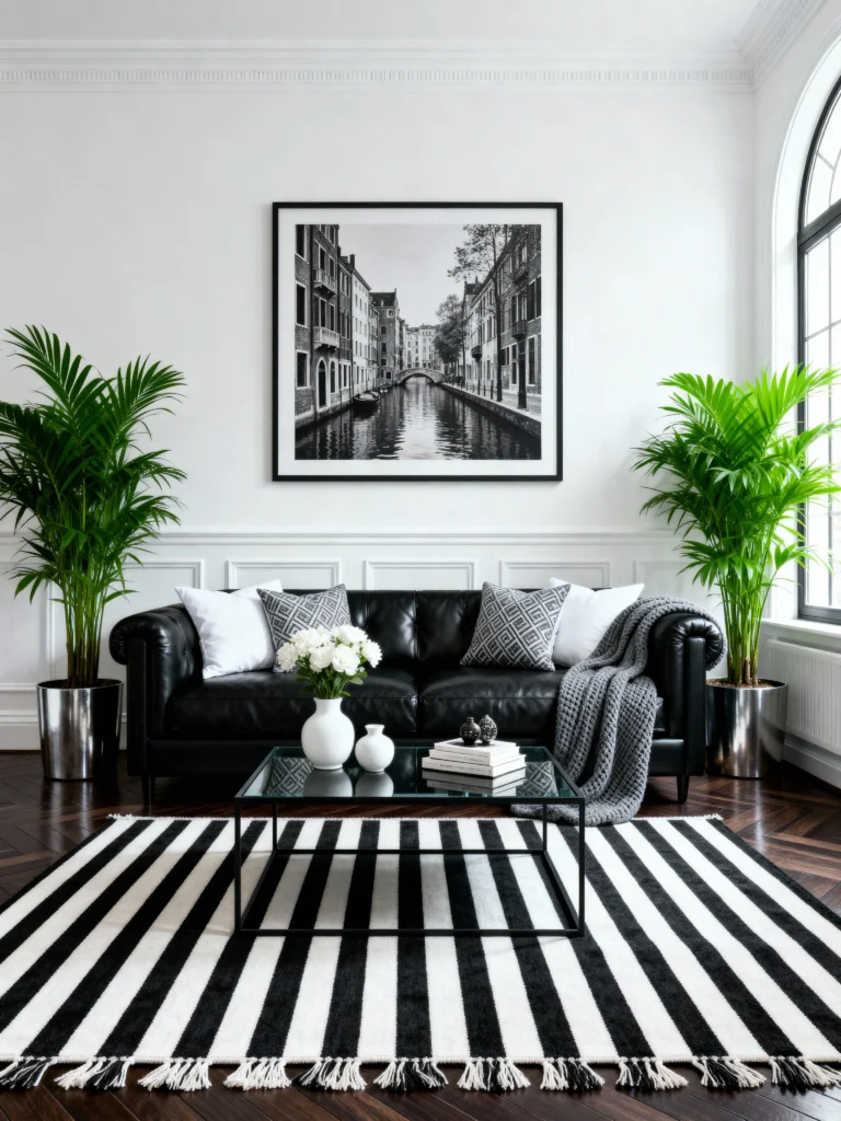 Bold, dramatic, and never out of style—black and white is iconic. White dominates to keep it light; black adds edge via furniture or rugs. Think minimalist or modern magazine vibes. Texture’s key—stripes or geometrics stop it from being sterile. Worried it’s too stark? Add a plant. I’ve seen this go zebra-level wild, but done right, it’s sleek and striking.