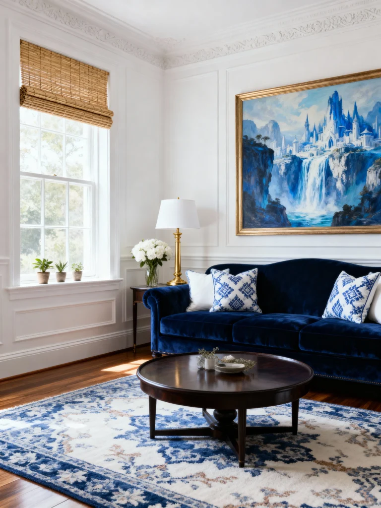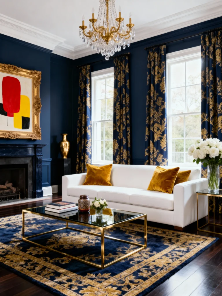 Fancy a touch of luxury? Navy and gold are your power couple. Navy’s deep and rich; gold’s the glam kicker. Try navy walls or a sofa, then accent with gold lamps or frames. It’s sophisticated without trying too hard. Don’t drown it in gold, though—less is more unless you’re a king. Personally, I love this combo—it’s like living in a swanky hotel (minus the bill). Classy living room vibes, incoming!