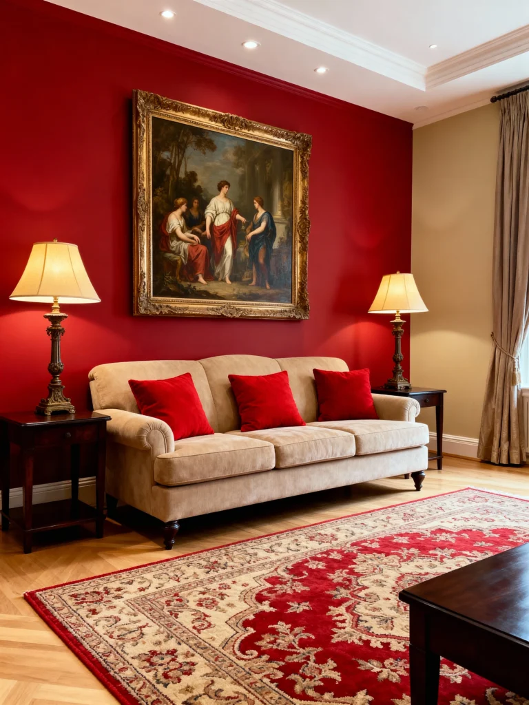 Red’s bold, but beige tames it into cozy territory. Beige walls with red accents—curtains, a chair—add warmth with a kick. Too much red, and it’s Valentine’s Day overload. This hits the sweet spot for drama and comfort. I’ve seen red scare people off, but paired like this? Inviting as heck. Perfect for a rich, welcoming feel.