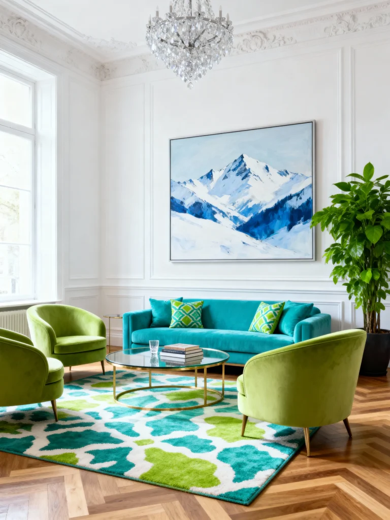 Want fresh and lively? Turquoise and lime are your BFFs. Both bright and bold, they make your space pop. Turquoise walls or furniture, lime in small doses—it’s modern and eclectic. Hard to feel down in this vibe. I’d kill for this energy on a dreary day. It’s like a tropical vacay without leaving home.