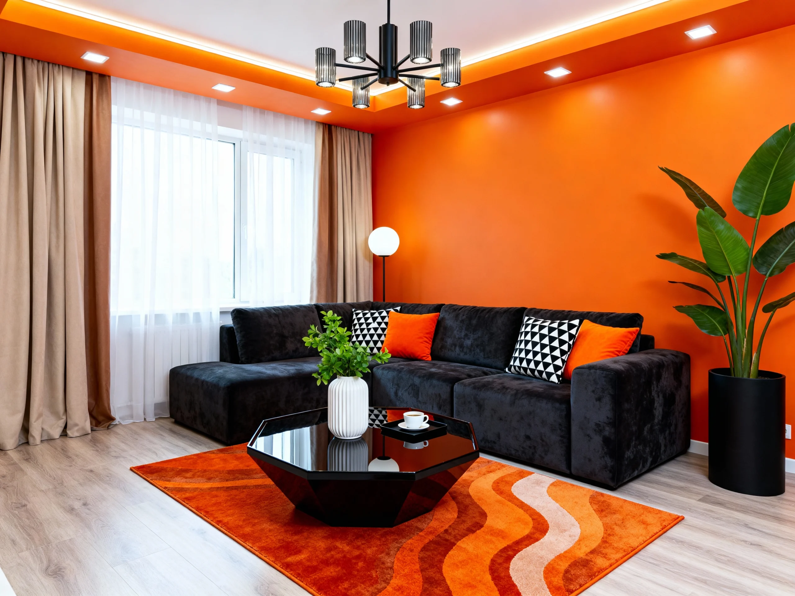 Paint the walls a vibrant burnt orange for high-impact drama. Choose a dark charcoal or black sectional sofa to ground the brightness of the walls. Hang a modern, black industrial chandelier to anchor the room’s height. Place a hexagonal black coffee table in the center for a sharp, geometric edge. Use a patterned orange rug to unify the bold color scheme and add visual interest.